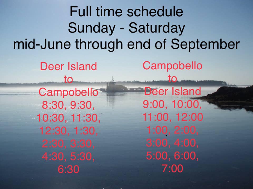 Leave Route 1 at St. George, NB and take Route 172 to L'etete, NB, Where free government ferries leave for Deer Island from 7am to 10pm daily (A.D.T) The last trip weather permitting