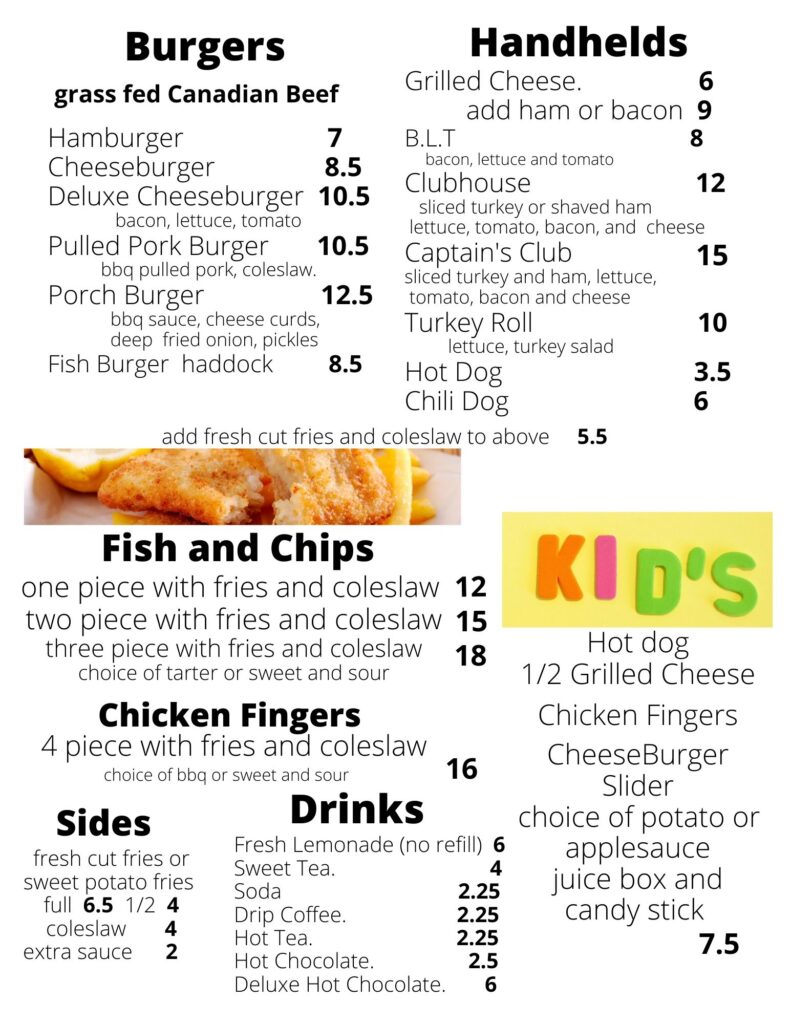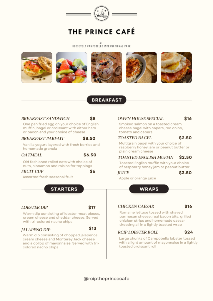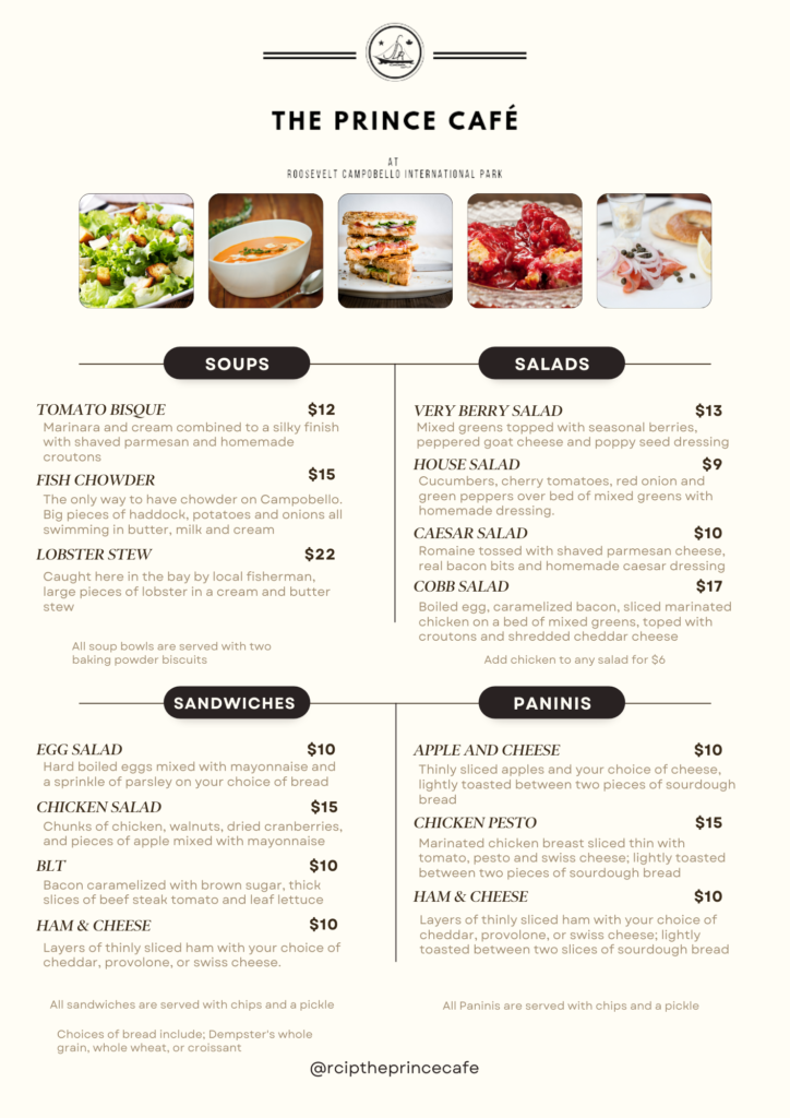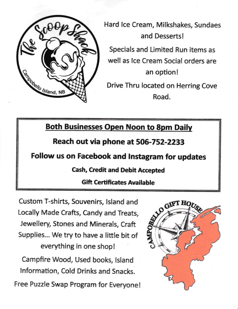 Enjoy the view at the seafood restaurant on Campobello in the summer months ! The Pier waterfront’s maple salmon dinner is so delicious and the salad with shrimp is so yummy! You can dine in or out on the deck to see the best view of the ocean while you enjoy fresh seafood…. The Porch is great spot to get seafood too and offers breakfast. The seafood chowders are amazing and the turkey dinner poutines are a favorite…. The Prince Cafe also offers breakfast , soup , sandwiches , salad and seafood. Located at the Roosevelt Park…. You can also order pizza and garlic fingers at the grocery store next the motel. The convenient store makes fresh subs and sandwiches! And you can get snacks and desserts at the scoop shack and gifthouse!